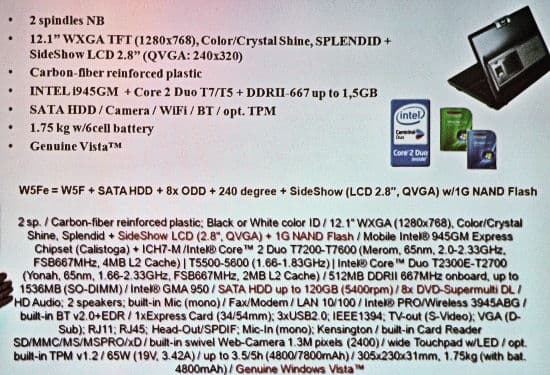 Первым был представлен ноутбук W5FE. Главной особенностью этой модели является наличие специального экрана в верхней крышке ноутбука, поддержка этой технологии появилась в Vista. Примерный аналог этой технологии уже представила в своем имиджевом ноутбуке Toshiba, только там экран маленький, в одну строку в переднем торце ноутбука, способный отображать лишь текстовую информацию. У ASUS это полноценный экран в 2,8 дюйма, на котором можно даже смотреть фотографии.