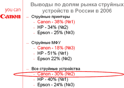 На самый быстрорастущий в России (и в мире тоже) рынок струйных МФУ компания Canon поставила в 2006 году 160 тыс. устройств (всего 2,4 млн. штук в EMEA) и заняла 18% рынка, по данным отчета Gartner. В этом году в данном сегменте также ожидается значительный рост.