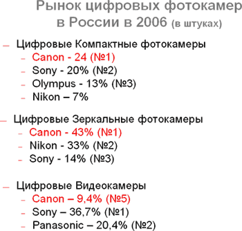 Здесь стоит отметить, что если доля Canon в сегменте компактных моделей фотокамер за год практически не изменилась, то новинки Nikon и выход Sony Alpha заставили Canon потесниться на рынке цифровых зеркалок.