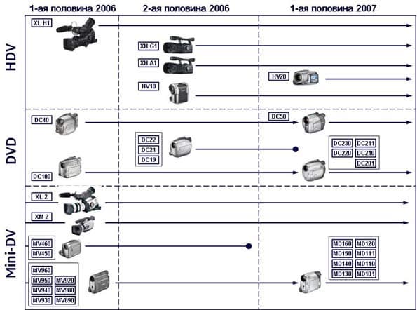 Далее докладчик представил обновленную продуктовую линейку видеокамер. В сегменте бытовых HDV-камер появилась модель HV20. Серия DVD-видеокамер пополнилась флагманской DC50 и группой камер DC230, DC220, DC211, DC210 и DC201, выполненных в корпусах различных цветов и слегка отличающихся друг от друга по характеристикам. MiniDV-новинки — это тоже целая россыпь похожих моделей: MD160, MD150, MD140, MD13, MD120, MD111, MD110 и MD101.