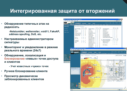 Немало повеселил зал рассказ о реакции беспроводного сегмента сети на появление «левой» точки доступа. По обнаружению её центральный узел вычисляет точное местоположение агрессора по уровню сигнала в соседних своих точках доступа и докладывает о нём администратору. Не дожидаясь его реакции, соседи устраивают на «вторженца» атаку DoS, и тем самым блокируют его. Последовал закономерный вопрос, как быть, если в соседних офисах в пределах здания развёрнуты беспроводные сети Cisco. Ответ таков: пока не будет предпринято правильное административное решение, ни одна из них работать не будет. Надо прописать все точки соседних сетей в «доверенный» список, но и тогда при обнаружении злонамеренной активности с их стороны они будут блокироваться.