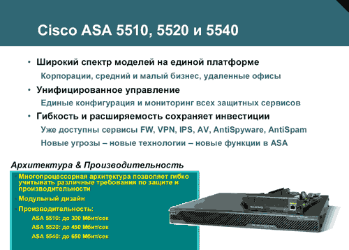 Представлены такие специализированные решения в частности модулями безопасности серии ASA 5000. Этот очень интересный доклад был последним в семинаре, осталось менее половины слушателей, время, отпущенное на семинар, давно истекло… Так что сказать можно было и гораздо больше. Вообще же по каждой из тем семинара можно было спокойно читать неделю установочный курс, и то не факт, что хватило бы времени.