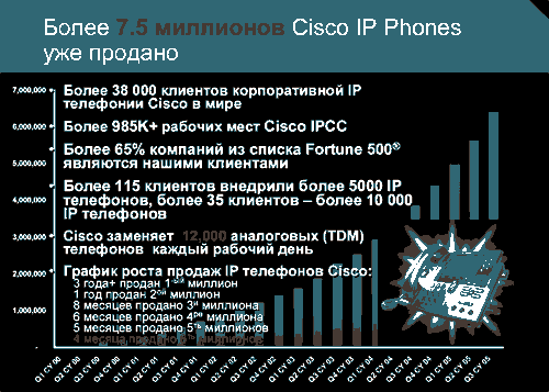 Динамика продаж IP-телефонов компании нарастает лавинообразно, есть клиенты, установившие свыше 10000 аппаратов, среди них IBM, Boeing, Oracle и Lloyds TSB. Все они положительно отзываются об экономическом эффекте от внедрения интегрированной системы общения.