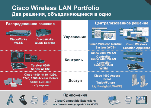 Для построения беспроводных сетей компания предлагает широкий спектр решений, которые базируются на двух противоположных архитектурных подходах. Во-первых, это «умные» точки доступа с развитой функциональностью, а во-вторых, простейшие точки доступа, подключаемые к интеллектуальным коммутаторам и специализированным модулям. Автономные функциональные модули предназначены для небольших и распределённых сетей. В частности, есть устройства для связи на больших дистанциях, максимально до 40 км, и двухдиапазонные, которые связываются с пользовательскими устройствами в диапазоне 2,4 ГГц, а на частоте 5 ГГц общаются с другими точками доступа, таким образом, что проводное подключение может иметь только одна из нескольких. Такая топология актуальна, к примеру, на больших складах, где трудно разводить кабели.