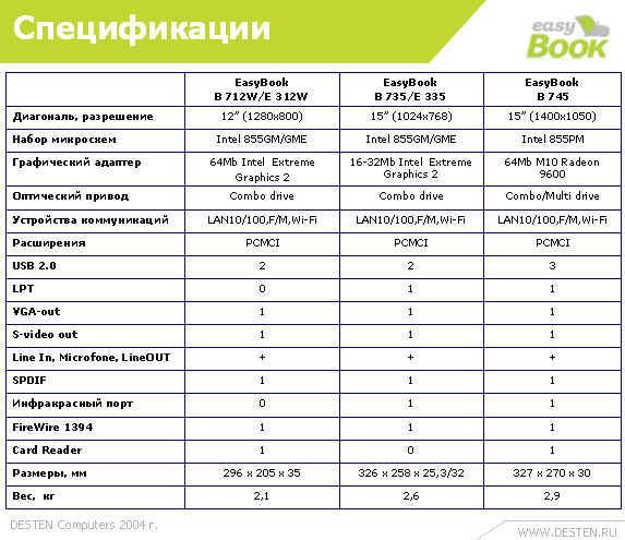 Ноутбуки DESTEN EasyBook производитель относит к классу «тонкие и легкие» и позиционирует для корпоративных пользователей. Все модели построены на базе хорошо известной платформы Intel Centrino для мобильных ПК.