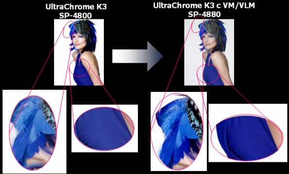 Среди преимуществ новых чернил также — очень быстрое время стабилизации цвета и сверхмалый уровень метамеризма. Стоит также отметить, что, несмотря на усовершенствование цветопередачи, в Ultra Chrome K3 Vivid Magenta по-прежнему остается восемь цветов-картриджей (впрочем, собственно чернильниц применятся девять: для матовой и глянцевой бумаги существует два разных вида чернил).