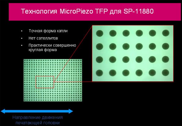 Для увеличения скорости печати было удвоено число дюз: теперь их стало 360 вместо 180. Помимо скорости печати было улучшено и ее качество: на отпечатках практически отсутствуют капли-саттелиты, стала более точной форма каждой капли.