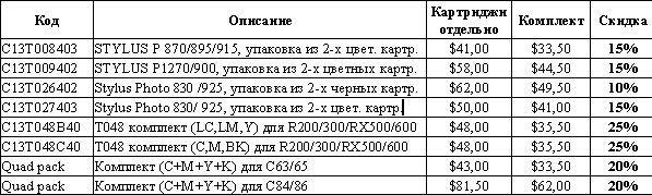 Еще больше сэкономить при печати пользователи смогут, воспользовавшись стартовавшими в сентябре месяце специальными предложениями по картриджам и фотобумаге. Представители Epson отмечают, что данные предложения стартовали только на рынках России и СНГ в знак признательности всем клиентам, выбравшим технику и оригинальные расходные материалы компании.Например, с сентября этого года в продаже можно найти комплекты из нескольких картриджей Epson, цена которых на 10-25% ниже, чем при покупке картриджей по одному. В акции участвуют картриджи для наиболее популярных моделей принтеров, как серии Stylus Photo, так и серии Color. Картриджи поставляются в упаковках по 2, 3 или 4 картриджа со скидкой. Более подробную информацию о специальных предложениях можно найти в таблице: