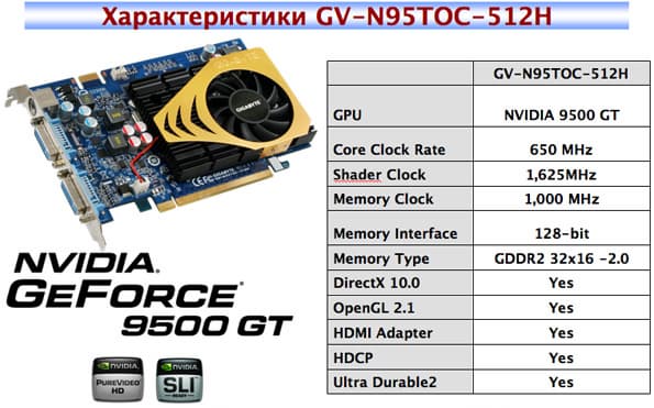 Плата GV-N95TOC-512H — это решение на ядре GeForce 9500 GT с частотой 650 МГц, частотой шейдерного блока 1625 МГц и частотой памяти DDR2 — 1 ГГц.