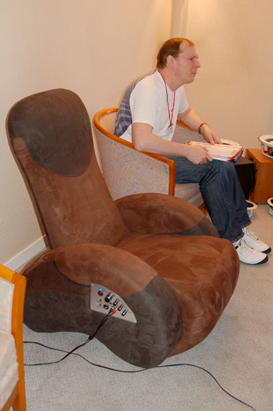 Также на выставке можно было увидеть и кресла со встроенными басовыми вибраторами. Все регулировки производятся с боковой панели