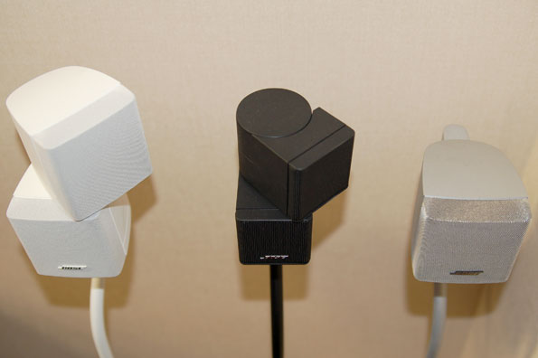 И снова оригинальные формы: футуристичные сателлиты Omnisat от Mirage с их оригинальным решением омниполярного звука. Для получения качественного звучания в них используется как прямой, так и отражённый звук: над каждым динамиком стоит специальная акустическая линза, рассеивающая волны