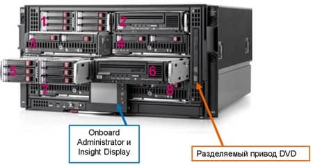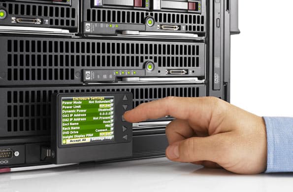 В HP BladeSystem c3000 встроен привод DVD и 3-дюймовый графический дисплей. Что касается последнего, то на нем отображается вся необходимая для контроля за инфраструктурой информация. Реализуется такая функция с помощью решения HP Insight Control, которое собирает данные с множества контрольных точек состояния системы — от подсистем энергоснабжения и охлаждения до сетевых соединений и подсистем управления производительностью.