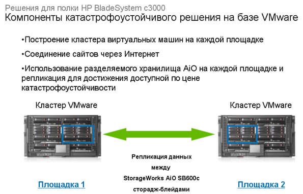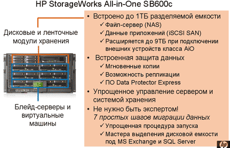 В рамках презентации была также представлена новая blade-система хранения данных HP StorageWorks SB600c All-in-One, которую можно использовать в составе новой модели полки. Эта система, как и другие решения семейства AiO, сочетает в себе сетевое хранилище данных (NAS), сеть хранения данных (SAN) и систему защиты данных.