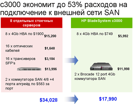 В качестве примера также был приведен приблизительный расчет стоимости полного решения HP BladeSystem c3000 на базе шести blade-серверов BL460c (с двумя 4-ядерными процессорами Intel Xeon в каждом), с дисковым блэйдом и ленточным накопителем, а также с коммутатором Ethernet уровня 2/3 — 30 тыс. долл. При этом система потребляет максимально 2,2 кВт электроэнергии.