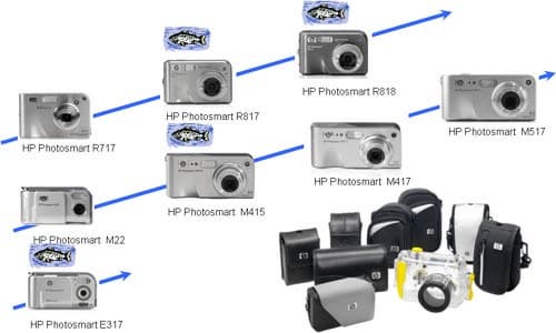 HP Photosmart E317, HP Photosmart M415 и HP Photosmart R817/R818 могут записывать видеоклипы со звуковым сопровождением. Поддержка технологии HP Instant Share дает возможность отправлять фотографии по электронной почте, обходясь без громоздких вложенных файлов, а технология PictBridge облегчает процесс распечатывания фотографий.
