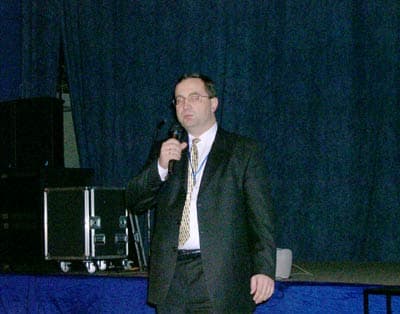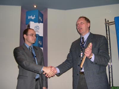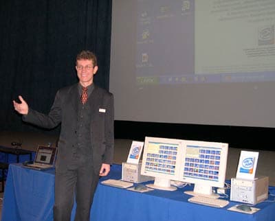 - Настольные ПК на базе процессоров Intel Pentium 4 с поддержкой технологии Hyper-Threading идеально подходят для многозадачных сред, часто встречающихся при малом бизнесе. Бернхард Рис наглядно продемонстрировал всем участникам Форума преимущества технологии HT — в зале было установлено две системы со схожими характеристиками, только одна из них поддерживала HT, а другая нет; на компьютерах были запущены одинаковые тестовые примеры, и было видно невооруженным глазом, что система с поддержкой Hyper-Threading справляется с задачами гораздо быстрее.