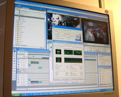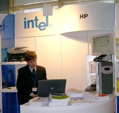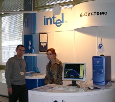 На стенде Intel был представлен образец системы на базе процессора Pentium 4 Extreme Edition, официальное объявление о начале поставок которого было сделано в начале ноября этого года, то есть чуть более месяца назад. Чипы Pentium 4 Extreme Edition работают на тактовой частоте 3,20 ГГц с FSB 800 МГц, поддерживают технологию Hyper-Threading, обладают 512 КБ кэша L2 и 2 МБ кэша L3!