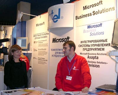 Компания Microsoft условно разделила свой стенд на две части — в одной из них были представлены Small Business Server, специально созданное универсальное решение для небольших компаний, и Office System 2003, официальное представление которой прошло в Москве в первых числах декабря, а в другой — продукты Microsoft Business Solutions-Navision и Microsoft Business Solutions-Axapta.