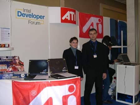 На совместном стенде ATI Technologies и ASUS можно было увидеть ноутбук ASUS L5C с видеоподсистемой Mobility Radeon 9000 DDR с 64 МБ и видеокарту Radeon 9800 XT.