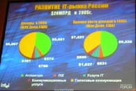 Г-н Дэвис привел довольно интересные данные, характеризующие распространение мобильных ПК во всем мире (по регионам — первый снимок), распространение точек доступа (второй снимок) и оценку развития IT-рынка России по секторам: ПО, аппаратура, услуги IT, коммуникационные услуги и голосовые коммуникации (третий снимок):