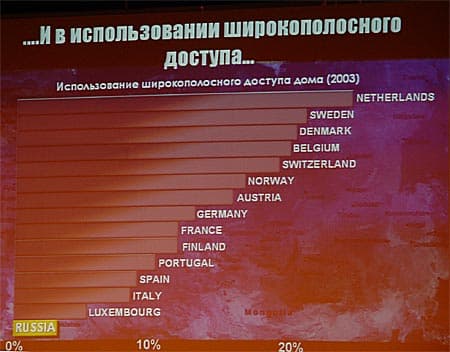 С точки зрения ИТ-бизнеса и условий его развития Россия стоит фактически в уникальных условиях. Причем уникальность эта имеет свои как положительные, так и отрицательные стороны. Наша страна показывает впечатляющие темпы роста рынка, входя по этому показателю в первую пятерку стран. На фоне общемирового снижения уровня инвестиций в ИТ-отрасль Россия демонстрирует рост порядка 15%. Но при всем при этом наша страна значительно отстает в общем развитии сетевой инфраструктуры, занимая по этому показателю 69 место. Для примера, первое место принадлежит Финляндии, страна «компьютерный рынок №1» — Китай — стоит на 43-ей позиции. При населении в 145 млн. человек в России лишь 7,5 млн. являются регулярными пользователями сети Интернет. В процентном отношении, увы, мы ближе к Эквадору, чем даже к бывшей союзной республике Эстонии, занимающей в вышеупомянутом списке 24-е место.