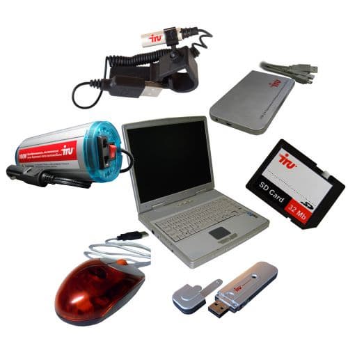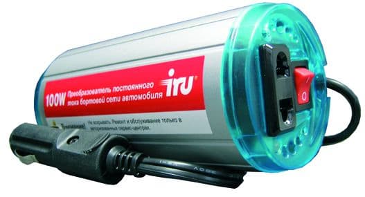 Автомобильный преобразователь DC / AC. Полезность этого аксессуара невозможно переоценить. Причем, поскольку в линейке ноутбуков iRU присутствуют модели с разным входным напряжением (производители ноутбуков никак не могут выработать единый стандарт, поэтому питание осуществляется по принципу «чтоб не как у других» — с разными вариантами напряжения и силы тока), то было принято абсолютно логичное и правильное решение выпустить универсальную модель, которая «добивает» напряжение обратно до параметров 220В/100 W — и уже оттуда можно подзарядить любой ноутбук. Дополнительным бонусом является возможность работы для любого устройства с небольшим энергопотреблением — телевизора, магнитофона…