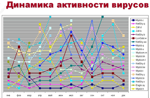 В апреле-мае десятки новых вариантов Mytob главенствовали в почтовом трафике и представляли собой главную угрозу.