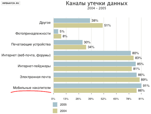 Как показали результаты исследования, наибольшую обеспокоенность респондентов вызывают мобильные накопители информации. Этот путь утечки данных опередил лидеров 2004 года — электронную почту, интернет-пейджеры и другие веб-службы. Объяснение положения можно найти в российской специфике этой отрасли кибер-преступности — хищение крупных баз данных, объемы которых исчисляются десятками гигабайт.