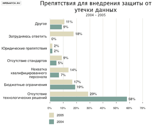 Ответы по ключевой проблематике исследования не выявили существенных изменений ситуации по сравнению с 2004 годом. Абсолютное лидерство сохранило «Нарушение конфиденциальности информации». При этом крупные и часть средних предприятий рассматривают эту проблему с внутрикорпоративной точки зрения (защита собственных активов), а малые предприятия — с точки зрения ситуации в стране в целом. В прошлом году продолжались скандалы с утечкой государственных баз данных, и поэтому сегодня можно составить цифровой портрет любого гражданина при помощи сведений с пиратского рынка.