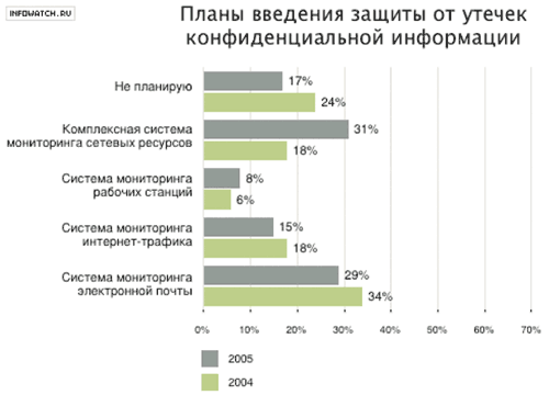 Планы по внедрению специализированных ИТ-систем для защиты от утечки конфиденциальной информации в ближайшие три года позволяют говорить, что ситуация медленно, но верно меняется к лучшему. Более чем на 20% снизилось количество организаций, которые не планируют установку таких систем, значительно увеличилось количество сторонников комплексного мониторинга сетевых ресурсов.