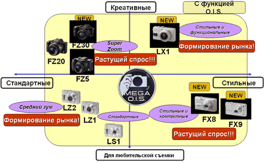 Переходя к представлению новых моделей Lumix, заметим, что к осени компания Panasonic выделила четыре категории камер, которые, по ее мнению, наиболее востребованы рынком: базовые модели (стандартные), стильные и компактные модели, модели с большим зумом и стильные и функциональные модели.