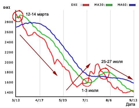 Пересечение DXI, то есть, средней цены за день, с MA30 сверху вниз (первое пересечение на вышеприведенном графике) означает dead cross, то есть, долговременное угасание активности рынка. Обратное пересечение — так называемый golden cross, означает резкий взлет активности рынка.