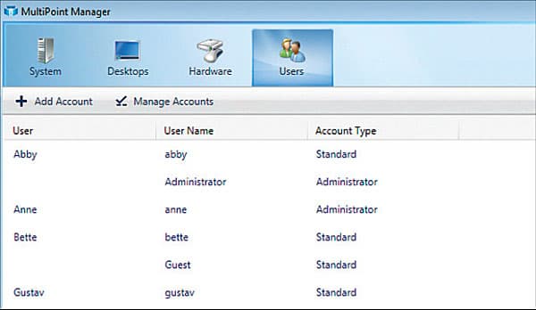 Все управление рабочими местами и их взаимодействием с узловым компьютером ведется через предустановленную утилиту MultiPoint Manager. Она предлагает лишь базовый функционал, но для начала этого вполне достаточно. Если же администратору понадобятся дополнительные возможности (например, возможность следить в прямом времени за тем, что делается на каждом из рабочих мест), он может приобрести дополнительное ПО. Например, AB Tutor Control.