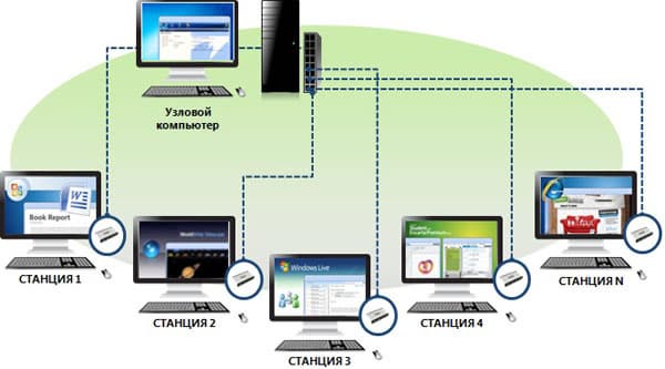 Итак, каков основной сценарий ее применения? Мы устанавливаем систему на один-единственный компьютер, к которому у нас подключены несколько рабочих станций (монитор + мышка + клавиатура). MultiPoint Server 2010 распределяет между ними системные ресурсы и обеспечивает абсолютно независимую работу пользователей. По идее, пользователи даже не заметят, что работают не на отдельном компьютере, а через некий узловой компьютер. Администратор может очень легко добавлять или убирать учетные записи, а также контролировать процесс работы каждого пользователя.