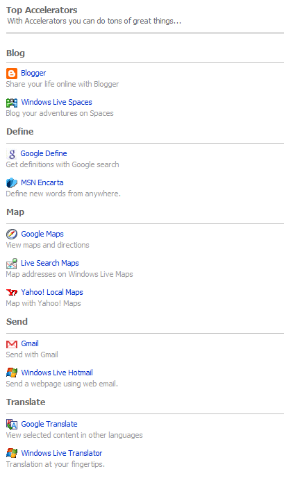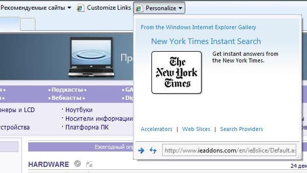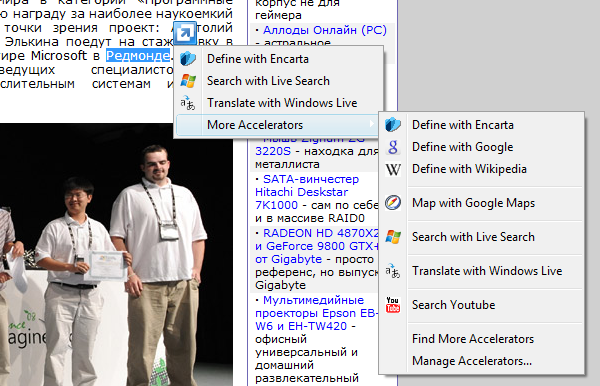 Еще одно новшество — возможность получать какую-либо информацию от сайта, вообще не заходя на него. Выглядит это следующим образом. Допустим, вы читаете текст, где вам попадается географическое название (Редмонт — где это?). Вы, никуда не уходя с открытой страницы, просто выделяете нужное слово, и справа у вас появляется стрелочка, кликнув на которую вы откроете контекстное меню. В нем вы выбираете Google.Earth или Wikipedia, и справа появляется мини-окно, в котором искомый город будет показан на карте либо же появится краткое описание его местоположения (в зависимости от сайта). Разумеется, для этого надо активировать соответствующую функцию — условно говоря, интегрировать ту же Википедию или Карты в ваш браузер. Но делается это весьма просто: браузер вас направляет к списку доступных акселераторов, из которых вы можете выбрать нужные вам. Пока выбор таков: