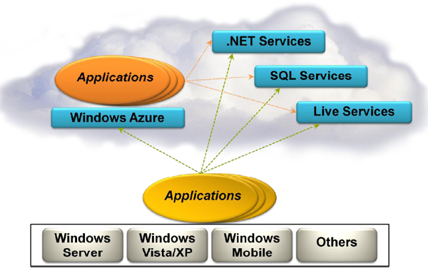 Azure является воплощением концепции S + S (Software + Services, то есть ПО + сервисы), следование которой в последнее время является одним из ключевых принципов Microsoft. Кроме того, в этой связи Microsoft вводит новое понятие: cloud computing («вычислительное облако», распределенная обработка данных в Интернете). В данном случае cloud computing объединяется с хранением, обработкой данных и организацией сетевой инфраструктуры на серверах, работающих в сети вычислительных центров Microsoft. Это позволяет разработчикам разворачивать приложения в «облаке» или локальной сети, и открывает широкие возможности для разработок под разнообразные требования потребителей и бизнес-пользователей.