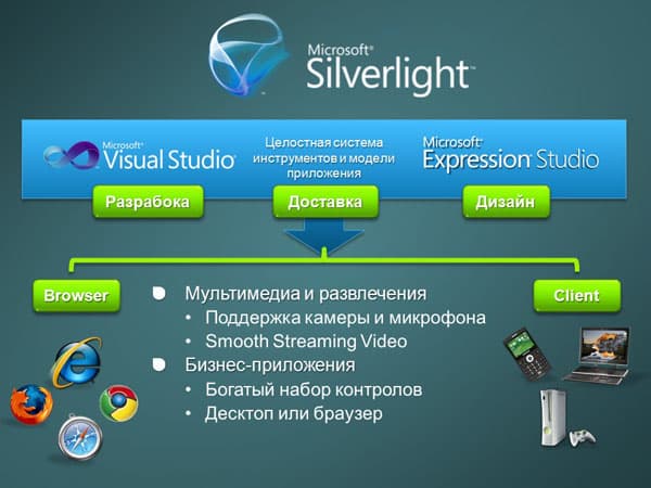 Это особенно актуально в контексте того факта, что практически одновременно с Visual Studio 2010 вышла новая — четветрая — версия Silverlight. В числе ее ключевых особенностей —поддержка браузера Google Chrome, а также улучшенная работа вне браузера и на мобильных устройствах Windows Phone 7.