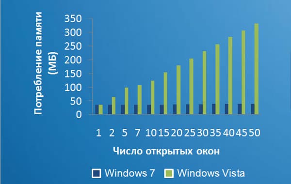 Быстродействие Windows 7 — один из главных аргументов Microsoft в призывах переходить на новую ОС. И действительно, повышение производительности по сравнению с Vista чувствуется сразу: новая система загружается заметно быстрее, чем Vista. Быстрее происходит и выключение, но до скорости выключения Mac OS X Snow Leopard и Leopard (которые выключаются почти моментально) здесь, конечно, далеко. Что же касается работы в системе, то никаких подтормаживаний не было заметно даже при открытии большого количества окон. В подтверждение этого Microsoft приводит следующую диаграмму.