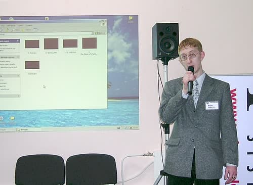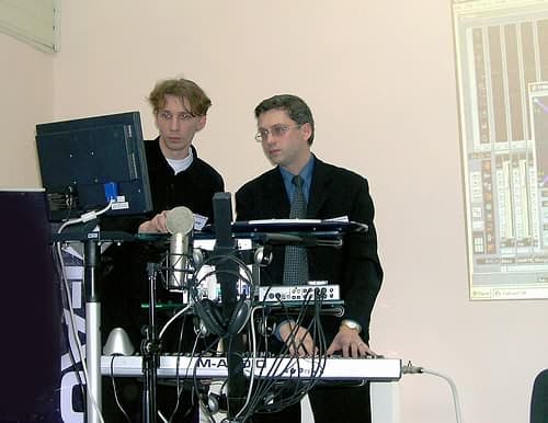 Далее в рамках презентации Дмитрий и Александр продемонстрировали на примерах некоторые приёмы работы в секвенсоре Steinberg CubaseSX. Интересно, что «умные» виртуальные VST-инструменты имитируют живое исполнение реальных инструментов в зависимости от манеры игры на MIDI-клавиатуре. Также сегодня можно создавать не только стерео-композиции, но даже с 5.1 звуковой дорожкой, в реальном времени управляя панорамой звукового трека в пространстве и записывая траекторию движения источника звука на automation-дорожку. Неизгладимое впечатление произвела демонстрация работы эффект-процессора, посылающего эхо-отражения звука из фронтальных каналов в тыловые.