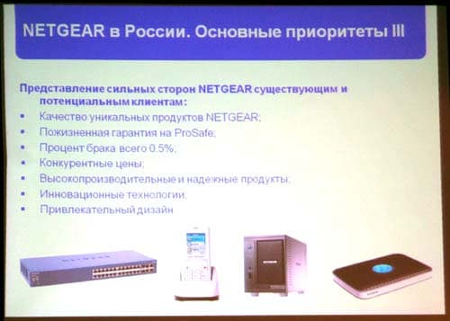 В России, где NETGEAR работает уже около двух с половиной лет, бизнес компании растет где-то на 70% ежегодно, в основном, конечно, за счет беспроводного оборудования и коммутаторов второго уровня. В 2007 году компания усовершенствовала структуру местной партнерской сети и провела реструктуризацию московского офиса, обновив кадровый состав. На должность генерального менеджера представительства NETGEAR в России был назначен Дмитрий Танюхин, перешедший в компанию из Lenovo, где он руководил отделом SMB Россия.