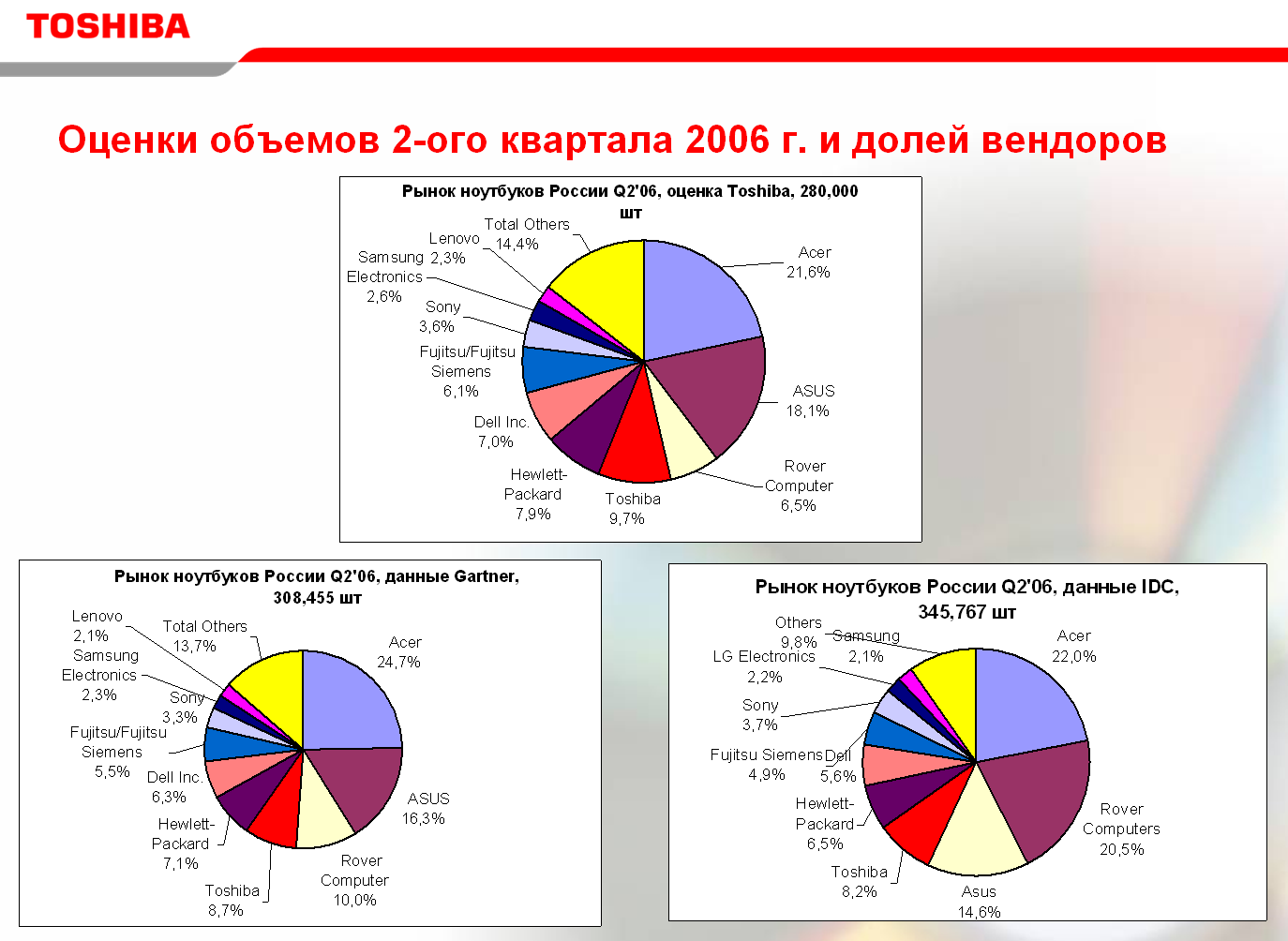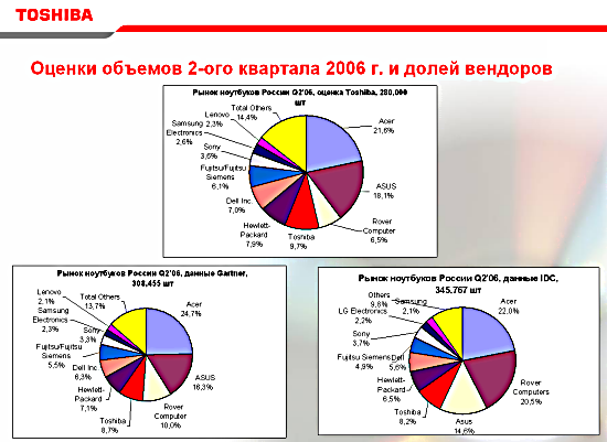 На нем приведены данные разных аналитических компаний по второму кварталу 2006 г., то есть он построен уже по известным результатам деятельности компаний в этот период. При этом объем рынка у всех получился разный, у Toshiba это 280 000 шт., у Gartner — 308 455, а у IDC — 335 767. И это речь идет уже о закрытом квартале, то есть данные должны быть четкими и объективными.
