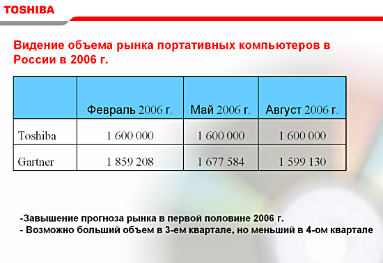 Представители Toshiba во время дискуссии представили два слайда. Первый из них показывает сравнительную оценку объема рынка Toshiba и Gartner. По собственным данным компании, объем рынка ноутбуков в 2006 году составит 1 600 000 единиц (причем Toshiba утверждает, что этот прогноз давался еще в феврале). Gartner дает следующие данные: в феврале — 1 859 208 ед., в мае прогноз упал до 1 677 584, в августе цифра упала до 1 599 130 ед. (данные взяты из представленного слайда Toshiba).
