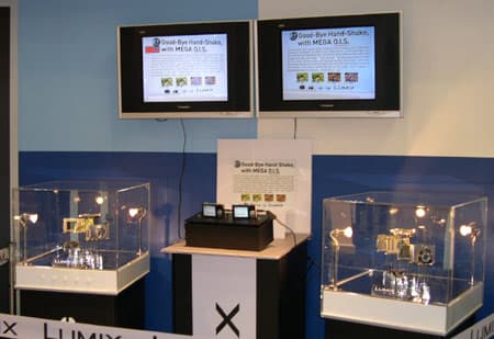 На стенде Panasonic можно было увидеть MEGA O.I.S. в действии. На демонстрационной площадке, создающей вибрации, подобные дрожанию руки, были установлены две одинаковые фотокамеры — одна с включенной системой стабилизации изображения, а другая, соответственно, — с выключенной. Объективы фотоаппаратов были направлены на тестовый плакат с многозначительным заголовком «Good-Bye Hand-Shake, with MEGA O.I.S.», а изображения с ЖК-экранов фотокамер транслировались на подключенных панелях. Зрелище впечатляющее! О значительной разнице можно судить даже по представленному фотоснимку: