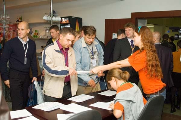 Театр начинается с вешалки, а любая конференция начинается с регистрации участников. Так и в этом случае, конференция начиналась на регистрации, которую проводили сотрудники pr-отдела компании ПИРИТ при поддержке юношей и девушек в радостных оранжевых футболках.