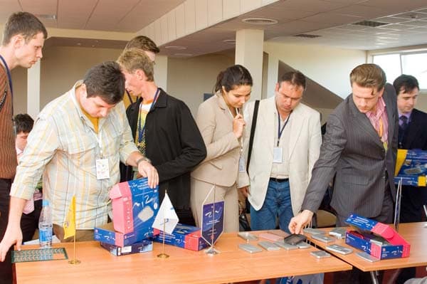 В зависимости от того, кем был участник конференции: представителем дилера, журналистом либо еще кем-то, ему вручался различный набор пакетов и сумок, заполненный справочно-рекламной информацией, образцом продукции одного из вендоров и расписанием конференции, а также беджик с различными цветами ленточек.