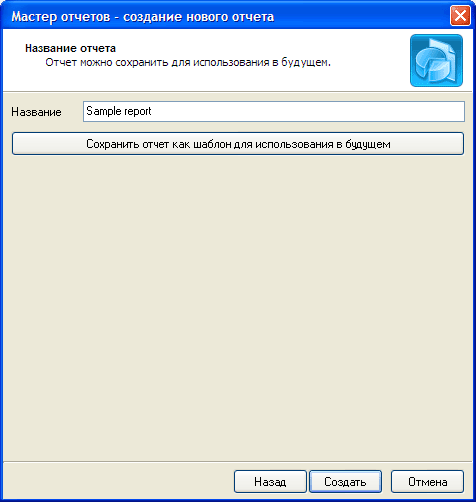 На завершающем этапе работы «Мастера» он предлагает сохранить отчет в виде шаблона для дальнейшего использования. Настроив параметры отчета один раз, и сохранив отчет, как шаблон, можно впоследствии генерировать отчеты по шаблону в ручном режиме или в автоматическом (консольном). Чтобы создать отчет, следует нажать кнопку «Создать». Сформированный отчет открывается в окне программы, а в меню «Отчет» становятся доступными команды печати, сохранения и отправки отчета по электронной почте.