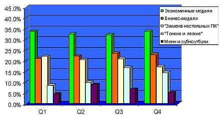 Что касается итогов 2003 года для компании Rover Computers, то они весьма внушительны. Напомню, что Rover по-прежнему остается одним из лидеров российского рынка компьютерных товаров, кроме того, в 2003 году компания отпраздновала своеобразный юбилей: выход в свет 250 000-го ноутбука. Этому событию была посвящена отдельная пресс-конференция и специальный репортаж с завода. Общий рост российского рынка ноутбуков, по представленным данным, составил 82%, т.е. рынок вырос почти вдвое (хотя немного не дотянул до круглой цифры). Лидируют по темпам, разумеется, недорогие модели нижнего ценового диапазона (их доля колеблется около цифры в 33%), за ними следуют с достаточно большим отрывом бизнес-ноутбуки (21-23%), которые в течение года обогнали машины другого достаточно популярного сегмента — замены десктопа (около 20%). Дальше идет также достаточно быстро растущий сегмент тонких и легких ноутбуков (рост с 10% где-то до 15%), и замыкает таблицу сегмент мининоутбуков (4-5%).