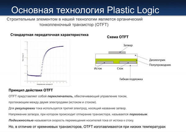 Ниже приведен слайд, на котором описаны органические тонкопленочные транзисторы – основная технология Plastic Logic.