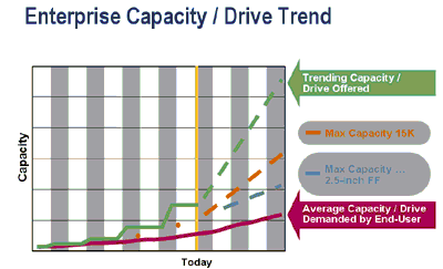 В чем же смысл создания нового продукта? По данным компании, рост плотности записи привел к тому, что предлагаемые на рынке корпоративных продуктов жесткие диски по своей емкости превосходят потребности пользователей. Наиболее востребованными, по мнению Seagate, остаются диски емкостью 73 и 36 ГБ (тенденции роста объема дисков приведены на диаграмме).