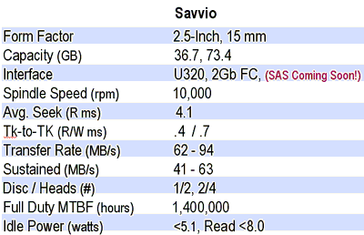 Обращают на себя внимание малые заявленные значения времени поиска, а также увеличенное время наработки на отказ. По заявлению компании Seagate, в сравнении с аналогичными дисками форм-фактора 3,5″ накопители Savvio занимают на 70% меньше места, они на 400 грамм легче, на 40% экономичнее по энергопотреблению, а время поиска сократилось на 15%. Кроме того, они позволяют использовать любой из трех интерфейсов — Fibre Channel, Ultra320 SCSI или Serial Attached SCSI, и обладают высокой надежностью (среднее время выработки на отказ составляет 1,4 миллиона часов). Благодаря этим преимуществам накопители Savvio представляют собой уникальное предложение в классе устройств со скоростью вращения шпинделя 10000 оборотов в минуту.